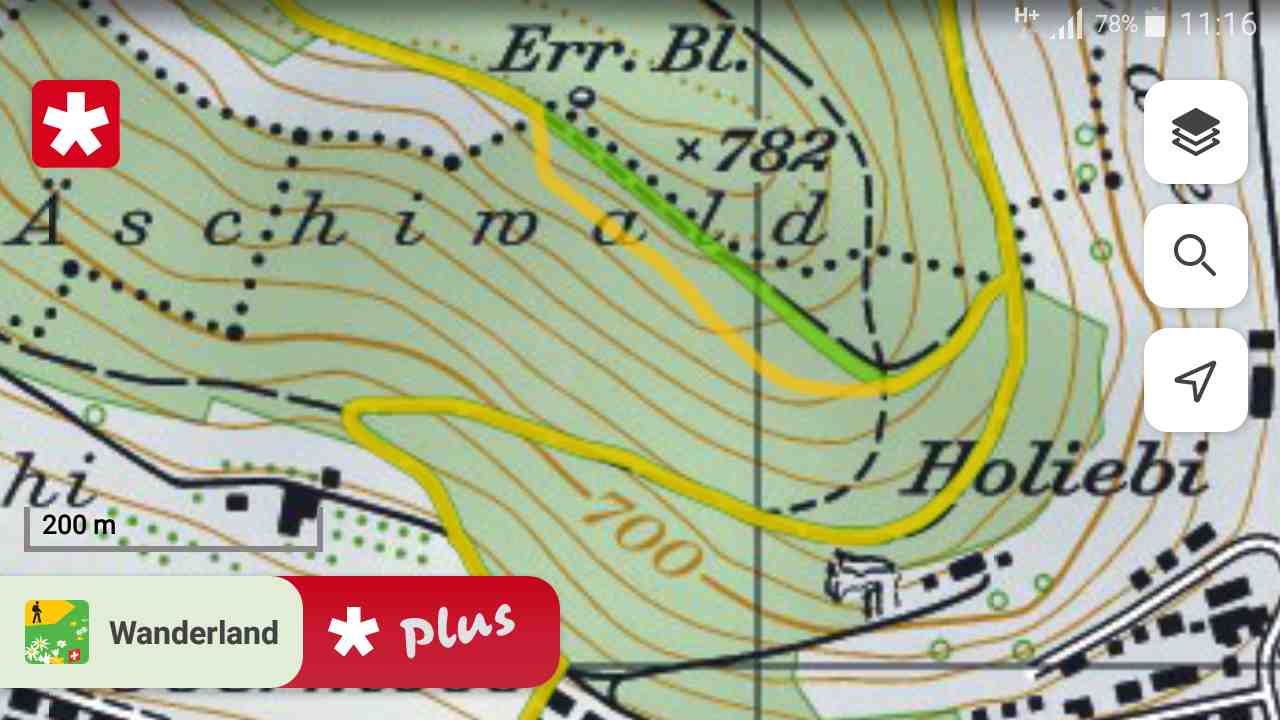 Grün leuchtet der zum Teil fiktive Weg (1987–2015). Sobald das Handy Datenverbindung hat, kommt gelb der neue, also der alte, kurz: der echte. Früher wurden die Wanderwege grün angezeigt; heute wird wie bei den Markierungen unterschieden: gewöhnliche gelb, gebirgige rot, alpine blau. Von Westen her gab und gibt es im Äschiwald tatsächlich ein Stück des «grünen» Wegs unterhalb des erratischen Blocks (seit 2011 «Wagnerstei»). Doch die Fortsetzung führt nicht hinunter nach Boll, sondern nach Norden um den Punkt 782 herum. Dies wird sichtbar, wenn man die Karte vergrössert; zudem «wächst» dann der Hügel um einen Meter – die Erklärung dazu folgt weiter unten.