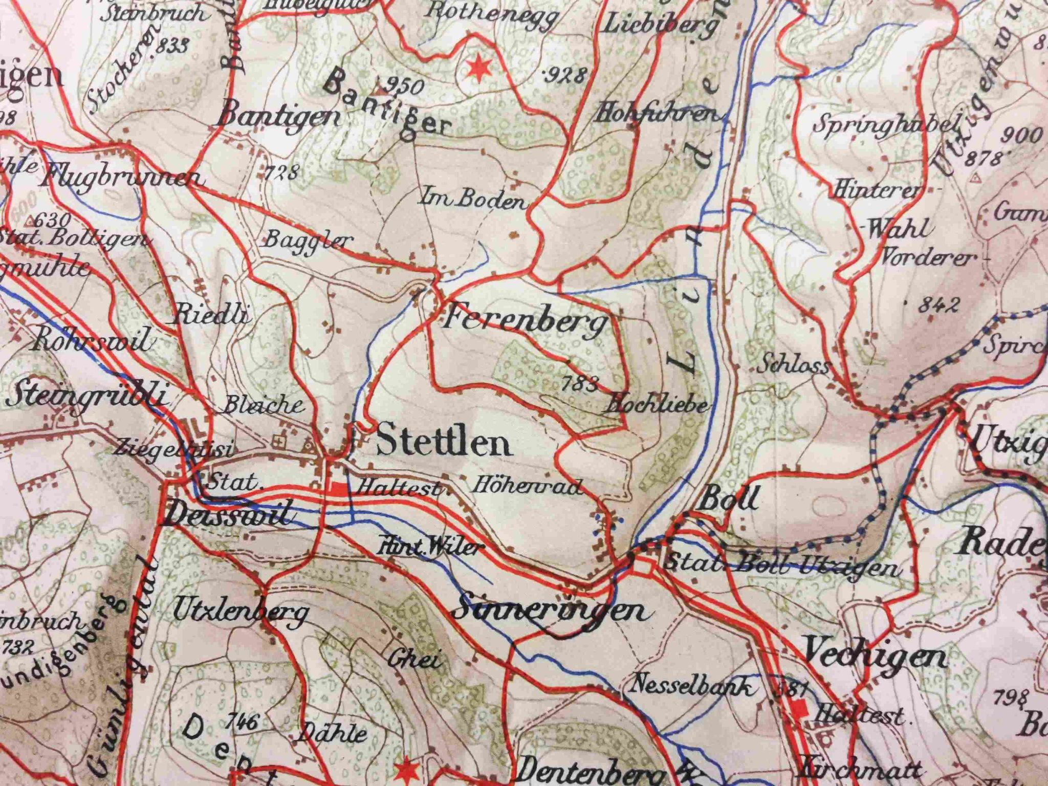 Das digitale Modell hat stellenweise zu Höhenkorrekturen geführt, so beim oben erwähnten Punkt 783. Diese neue Höhenangabe ist zufällig auch die ganz alte auf der Wanderkarte von 1952. Freilich hätte damals 785 stehen müssen, wie auf der offiziellen Siegfriedkarte. Als die von der modernen Landeskarte abgelöst wurde, «sank» die ganze Schweiz um 3 m, entsprechend der Neuvermessung des Referenzpunkts in Genf (Pierre du Niton); der Hügel ob Boll kam also auf 782. Dieser Wert taucht auch auf der aktuellen Online-Karte noch auf, wenn man den Massstab verkleinert.